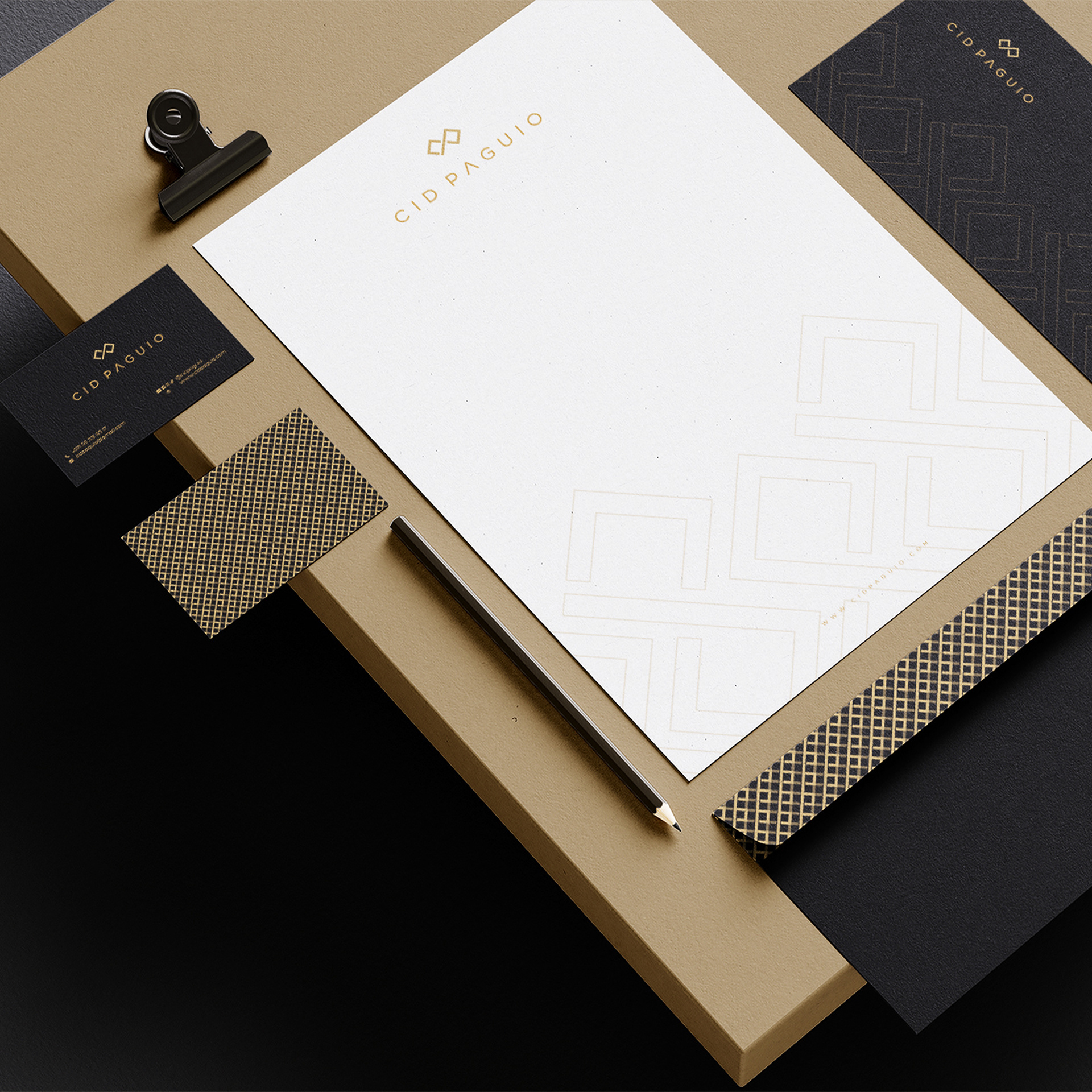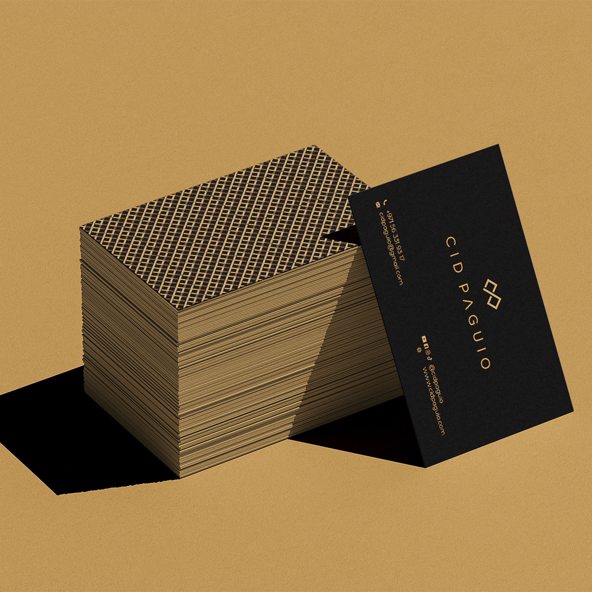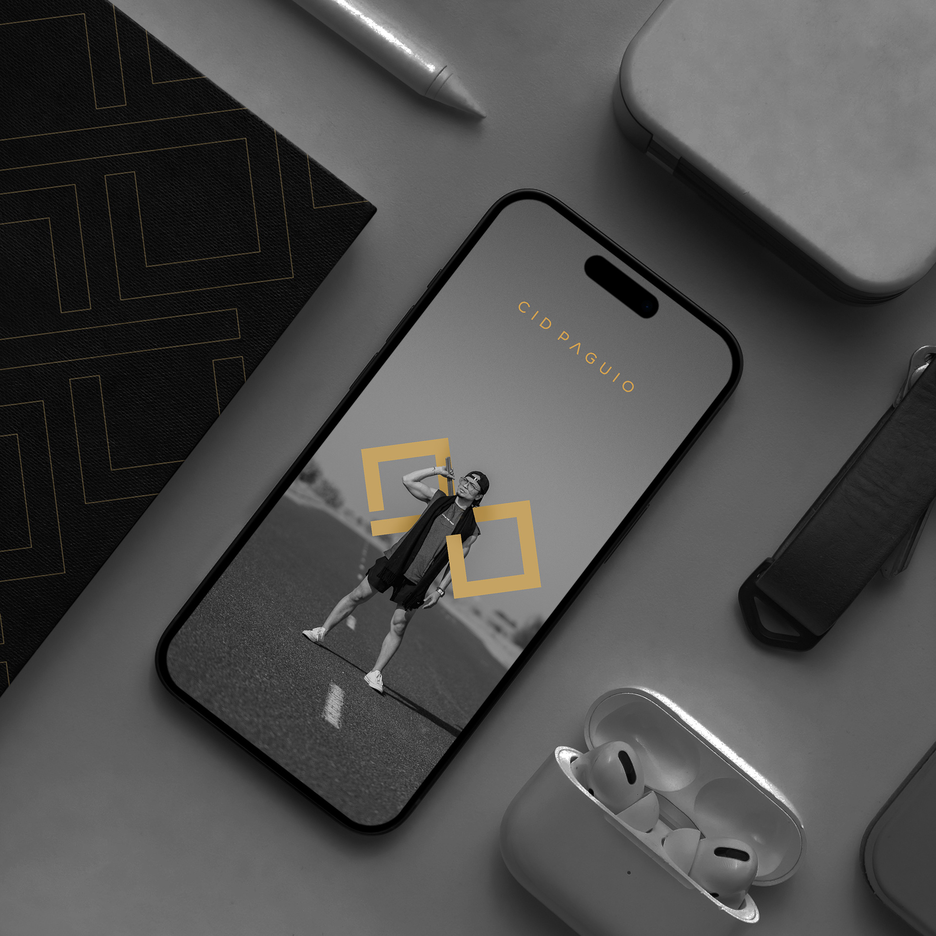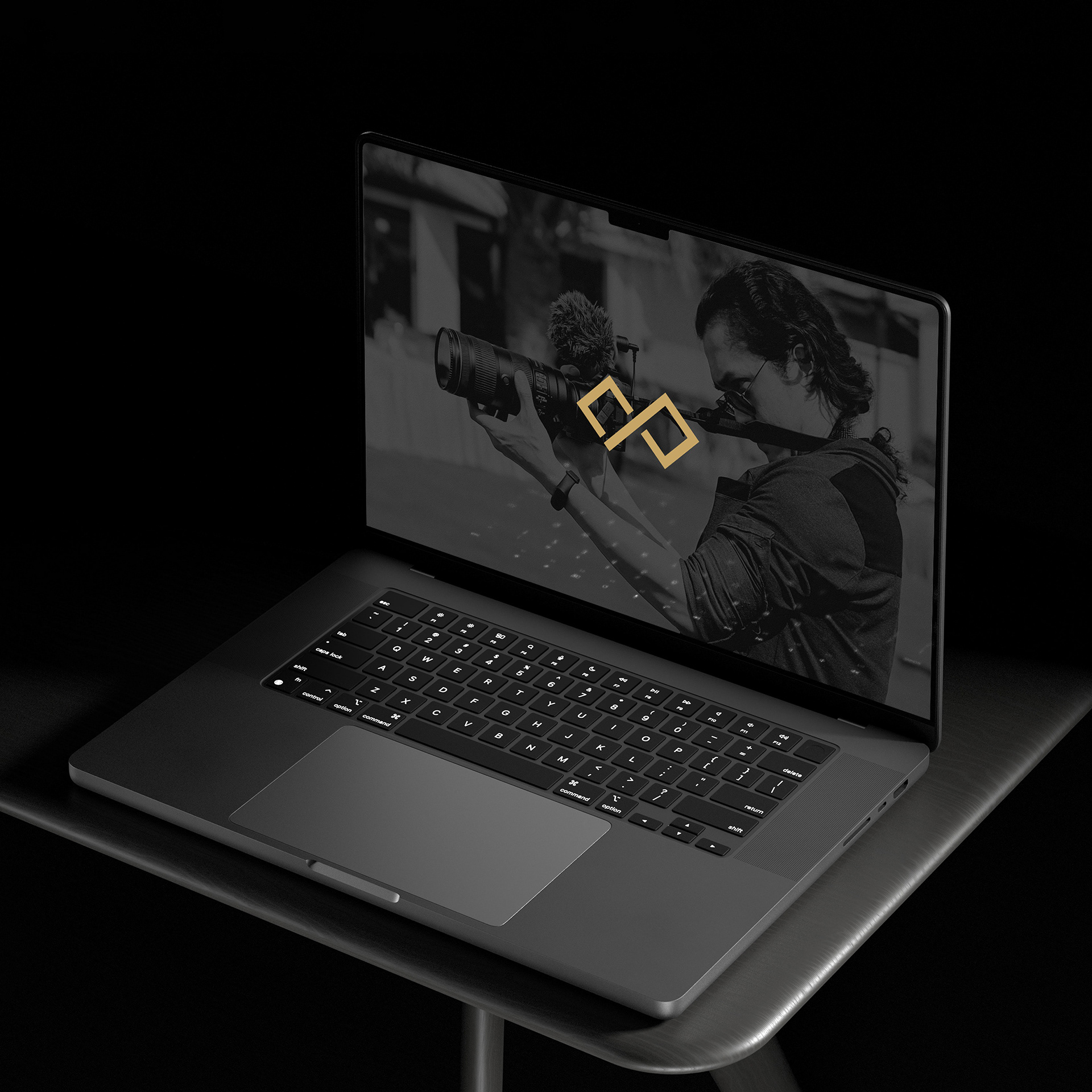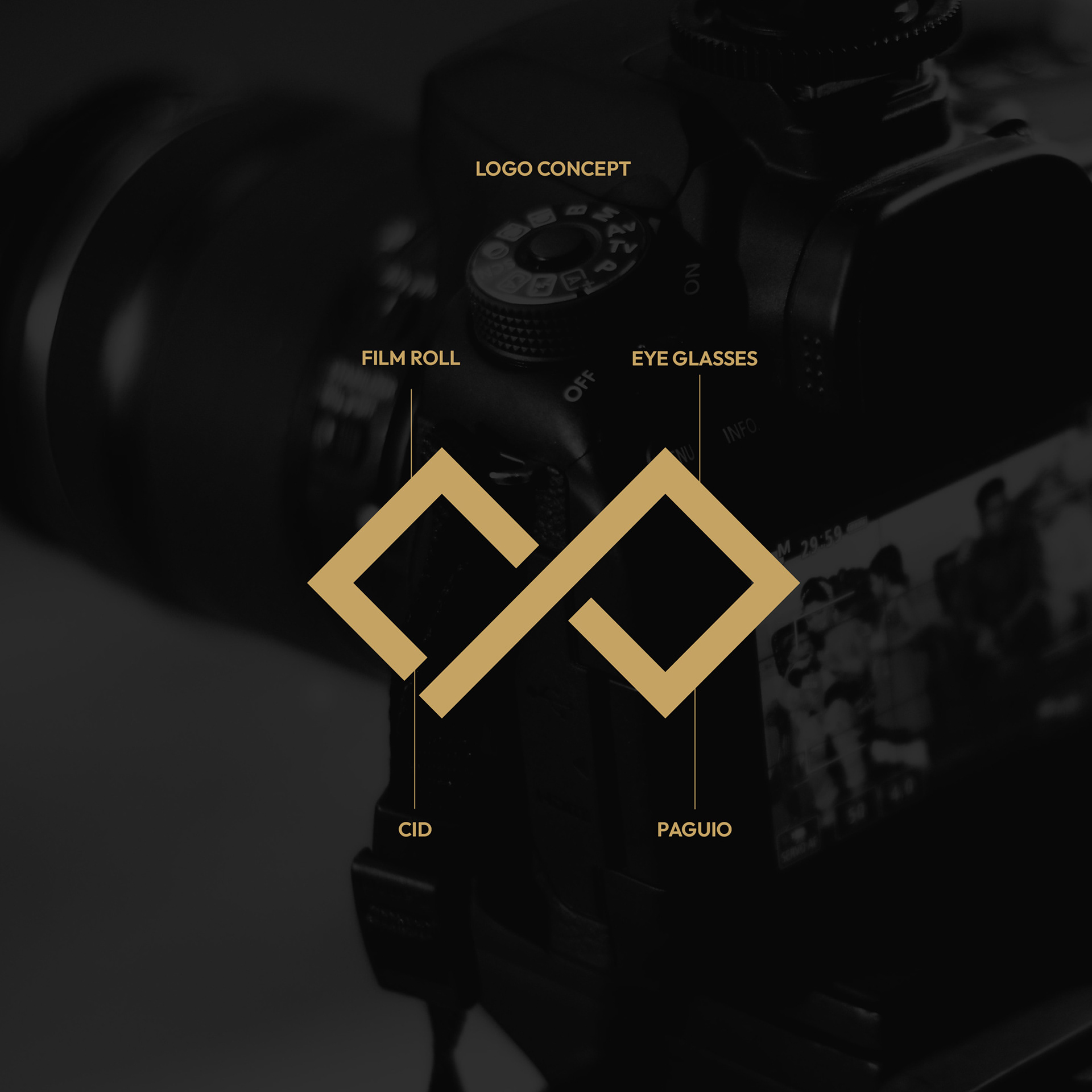 His logo combines his initials, eyeglasses, and a film roll—crafted in a gold and black palette to reflect a timeless, premium identity rooted in storytelling and vision.